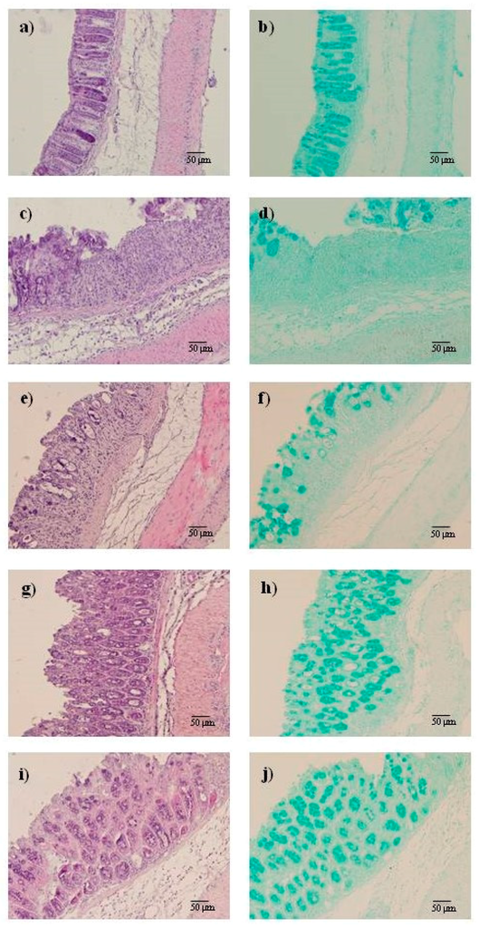 11-hydroxy-1′-O-methylamentadione (AMT-E) administration attenuate microscopic colon damage induced by dextran sulfate sodium (DSS); this effect is detected in Haematoxylin/Eosin and also in Alcian Blue stain sections where positive goblet cells were more clearly observed in preserved regions of the mucosal layer in mice treated with different dose of AMT-E. Histological appearance of samples taken from middle to distal colon of mice: (a,b) Sham group; (c,d) DSS group; (e,f) DSS plus AMT-E (1 mg/kg, p.o.); (g,h) DSS plus AMT-E (10 mg/kg, p.o.) and (i,j) DSS plus AMT-E (20 mg/kg, p.o.). Original magnification 200×.
