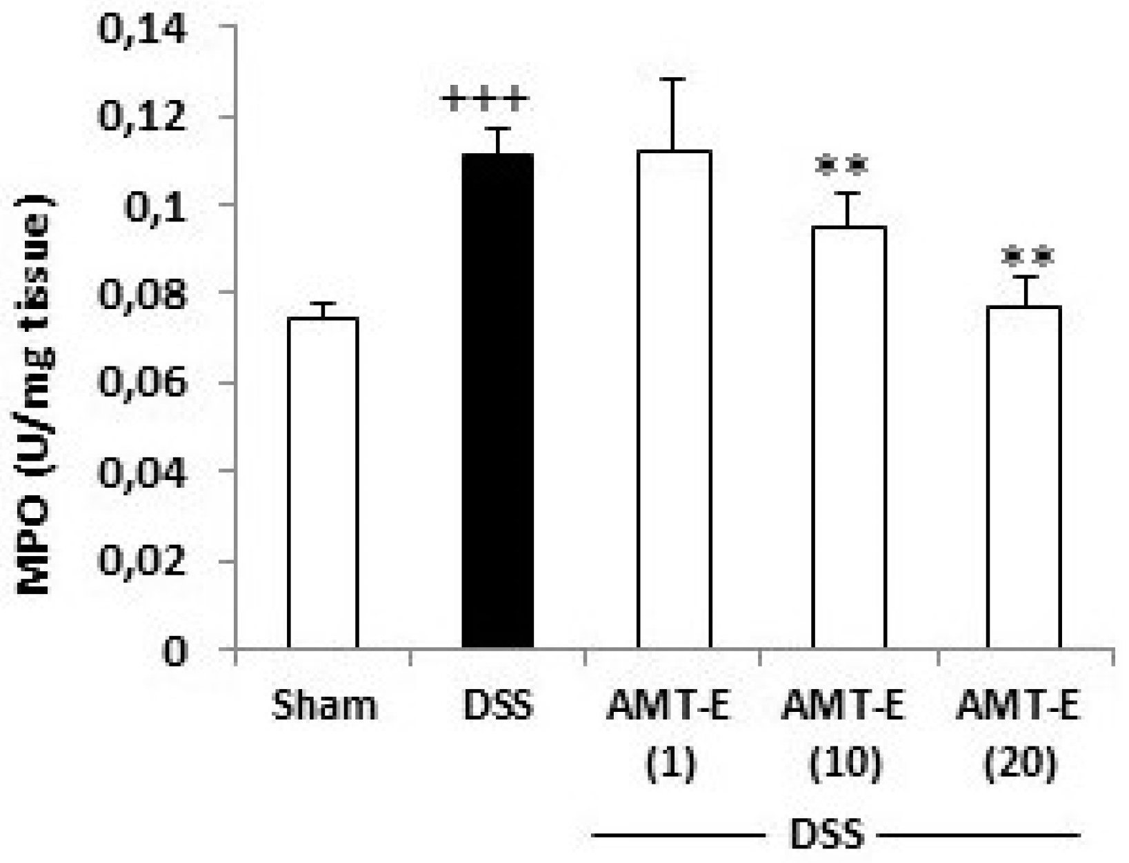 The histopathology study indicated that a mechanism underlying the protective effects of AMT-E involved a reduced infiltration of inflammatory cells into the colonic mucosa. Thus, colon inflammation was quantitatively evaluated by MPO activity. As shown in Figure 4, DSS induced a significant increase in colon MPO activity from 0.07 ± 0.003, a basal concentration, to 0.11 ± 0.006 U/mg tissue (p < 0.001 vs. Sham group) after 7 days of DSS administration. The treatment with AMT-E at the doses of 10 and 20 mg/kg significantly suppressed the degree of polymorphonuclear neutrophil infiltration in colon tissue (0.09 ± 0.007 and 0.07 ± 0.0006 U/mg tissue, respectively, p < 0.01 vs. DSS group), Figure 4.
