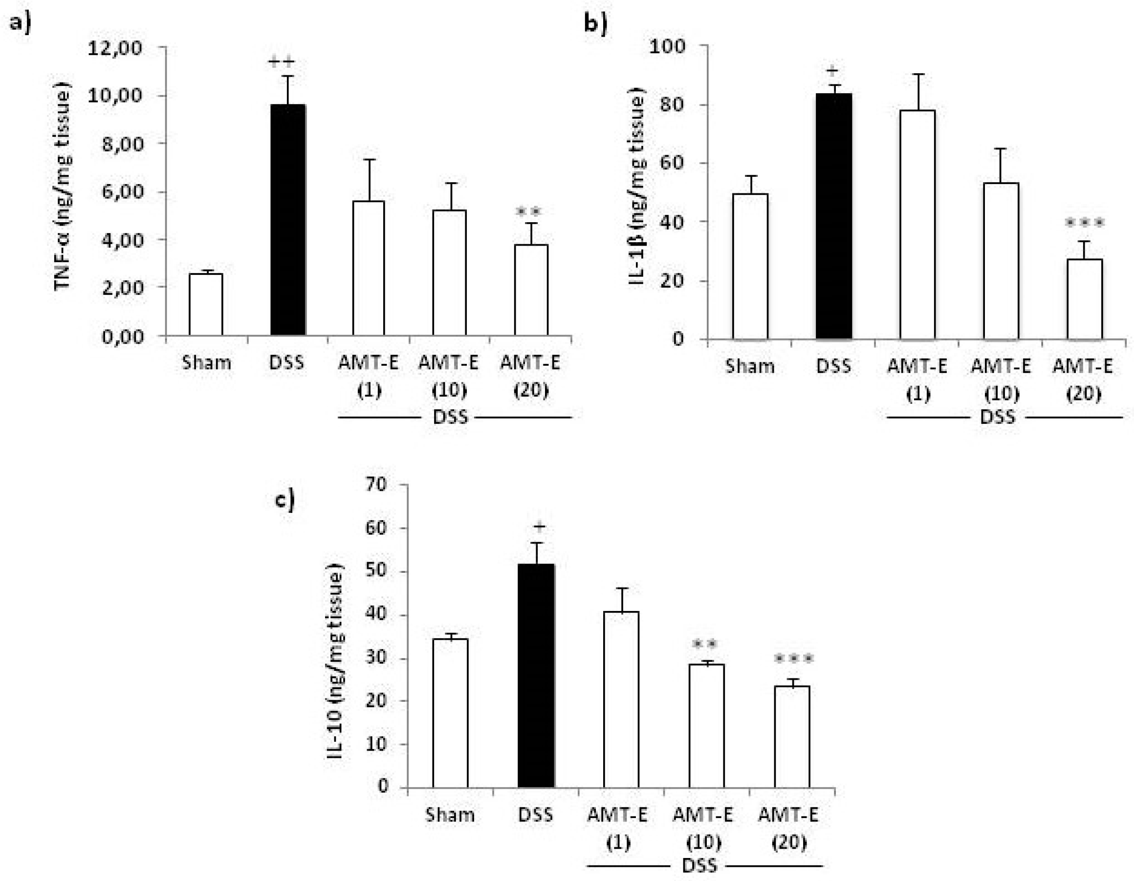 To investigate the influence of AMT-E on cytokines production, we measured the levels of pro-inflammatory (TNF-α and IL-1β) and anti-inflammatory (IL-10) cytokines in the colonic tissue from different treatment groups. As shown in Figure 5, the levels of TNF-α and IL-1β were increased in the colon tissues from DSS-treated mice compared to that in control animals. Furthermore, the administration of AMT-E at a dose of 20 mg/kg significantly reduced the levels of these cytokines by 60% (p < 0.01) and 67% (p < 0.001), respectively, with respect to DSS group (Figure 5a,b). As regards IL-10, this cytokine was up-regulated in DSS-treated mice compared with Sham group. Interestingly, 10 and 20 mg/kg of AMT-E resulted in a significant decrease of IL-10 values compared with DSS group (Figure 5c).