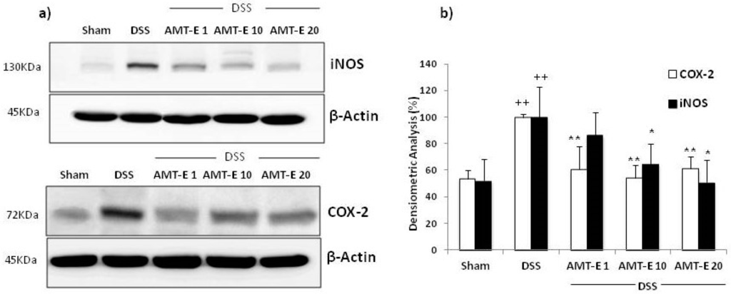 The effect of AMT-E on the expression levels of COX-2 and iNOS in cytosolic extracts from colonic mucosa was evaluated by Western blot analysis. The expression of both proteins was significantly increased in the colon tissues from DSS-treated mice compared with those in control mice (p < 0.01). However, administration of AMT-E significantly reduced the DSS-induced expression of COX-2 and iNOS that were decreased to basal levels with different doses of AMT-E (Figure 6).