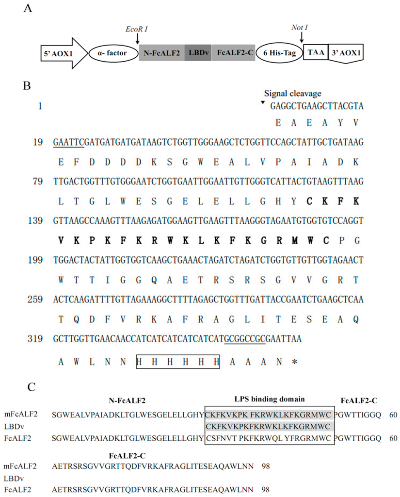 The nucleotide sequence and its deduced amino acid sequence of the modified anti-lipopolysaccharide factor isoform 2 from Fenneropenaeus chinensis (FcALF2) gene (mFcALF2). (A) Schematic representation of the vector pPIC9K-mFcALF2; (B) The LBD region of mFcALF2 is shown in bold and the stop codon is indicated by an asterisk. The restriction enzyme sites are underlined. The 6× His-tag is shown in box; (C) Multiple sequence alignment among mFcALF2, FcALF2 and LBDv.