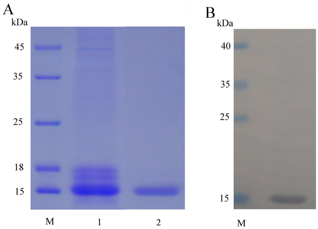 Detection of the recombinant mFcALF2 protein. (A) SDS-PAGE analyses of the recombinant mFcALF2 protein. Lane M in A and B represent molecular mass standards. Lane 1 shows the concentrated protein in supernatant secreted in GS115. Lane 2 shows the purified mFcALF2 protein; (B) Western blot analysis of the recombinant protein by anti-His tag antibody.