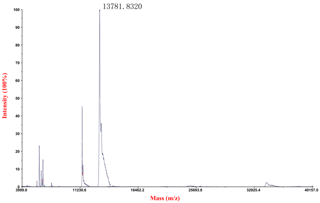 The recombinant plasmid was constructed using the EcoRI and Not I restriction enzyme. The recombinant plasmid was linearized and transformed into P. pastoris GS115 competent cell by electroporation. After transformation, the transformants were grown on MD plates. Some colonies were selected randomly and identified by PCR reaction with 5’AOX1 and 3’AOX1. Four positive colonies were picked and cultured for small-scale expression trials. Then we selected a positive transformant for large-scale production. The culture supernatant was analyzed by 15% SDS-PAGE and one major protein band with the molecular weight of about 15 kDa was detected (Figure 2). After Ni2+-chelating chromatography purification, the recombinant mFcALF2 protein was detected by HRP-conjugated anti His-Tag mouse monoclonal antibody, which showed that the recombinant protein was the target protein (Figure 2). Using the constructed recombination system, about 1.2 mg recombinant mFcALF2 protein could be obtained from 1000 mL crude extract. The molecular mass of purified mFcALF2 protein was determined using matrix-assisted laser desorption ionization mode (MALDI/TOF) mass spectrometry, and the molecular weight of the purified mFcALF2 protein was about 13781.8320 Da (Figure 3). All these data indicated that the purified recombinant protein was mFcALF2 protein.