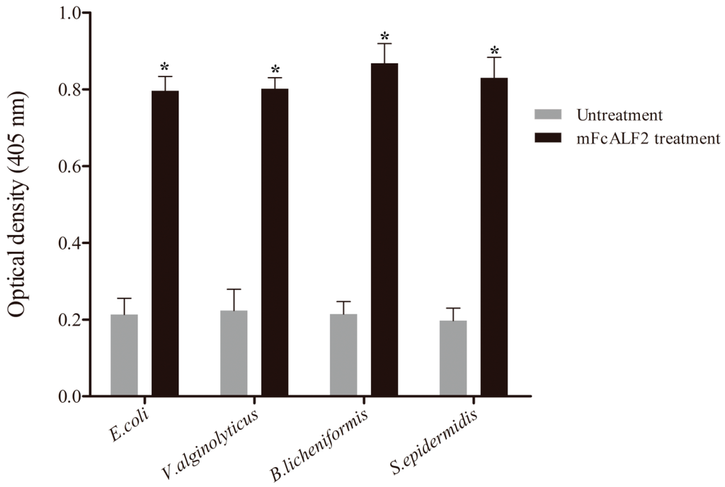 The binding of mFcALF2 to four species of bacteria, including E. coli, V. alginolyticus, B. licheniformis and S. epidermidis, was examined by indirected ELISA according to the method described previously [28]. The freshly cultured bacteria were collected and washed with PBS three times. Then the bacteria were resuspended by coating buffer (Na2CO3 1.59 g/L, NaHCO3 2.93 g/L, pH 9.6) to 108 cfu/mL. A 96-well plate was coated with 100 μL of bacteria suspension at 4 °C overnight. Then the wells were washed and blocked with 5% nonfat milk in Tris-buffered saline (TBS) buffer at 37 °C for 2 h. After three washes with TBS, 100 μL of mFcALF2 (32 μM) were added and incubated at 37 °C for 2 h. The wells were washed three times, and 100 μL HRP-conjugated anti-His Tag mouse monoclonal antibody (1/2000 diluted in TBS) was added. After incubation at 37 °C for 2 h and washing as described above, the reactivity was measured using 100 μL soluble TMB substrate solution (TianGen, Beijing, China). The absorbance was measured at 405 nm. The assay was performed in triplicates in three independent experiments.