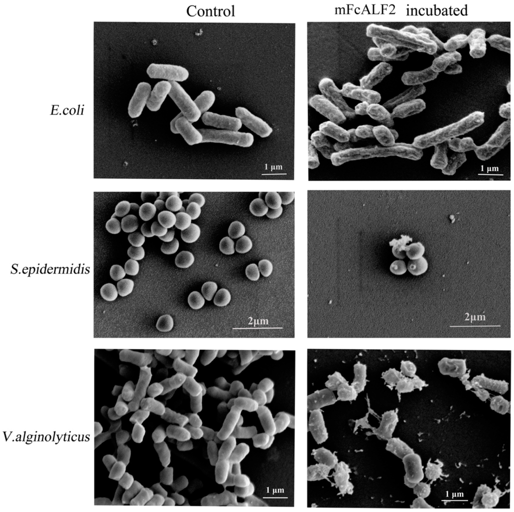 Morphology of bacteria after treatments by recombinant mFcALF2. The 108 cfu/mL different bacteria are incubated with 32 μM LBDv peptide for 2 h. The bacteria treated with same concentration pGFP peptide are used as negative control. Bar scale is 1 μM.