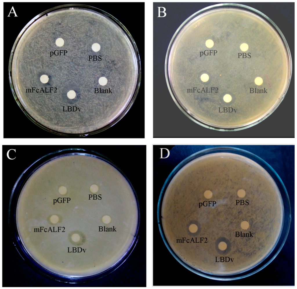 Inhibition zones of recombinant mFcALF2 to different bacteria: (A) E. coli; (B) V. anguillarum; (C) B. licheniformis; and (D) S. epidermidis. ‘‘Blank’’ represents blank group with nothing added. ‘‘PBS’’ represents control group with only PBS. ‘‘pGFP’’ represents negative control with synthetic pGFP peptide. “LBDv” represents positive control with synthetic LBDv peptide. mFcALF2 represents the recombinant protein. Twenty microliters of 32 μM protein/peptide solution is added to the center of filter paper.