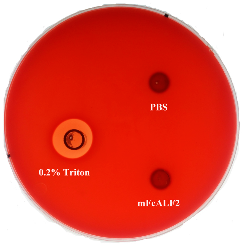 The hemolytic activity of mFcALF2 was checked on sheep blood agar plates. No obvious hemolytic activity was observed for mFcALF2 (Figure 7).
