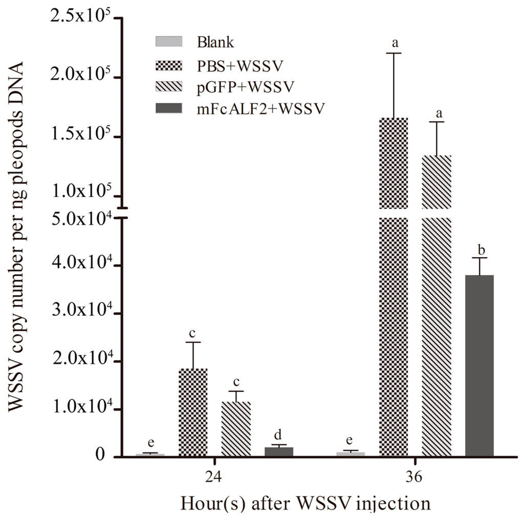 Detection of viral loads in L. vannamei after injection of WSSV incubated with recombinant mFcALF2. Data represent the means ± S.E. Lowercase letters (a, b, c, d and e) represent significant difference among treatments at p < 0.05. Three replicate experiments are performed. The data were analyzed based on ANOVA with post hoc.
