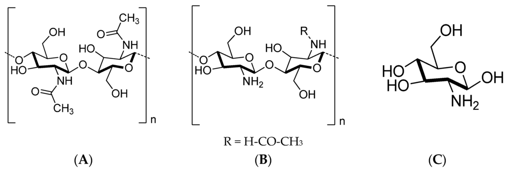 Chemical structure of (A) chitin; (B) chitosan; and (C) glucosamine.