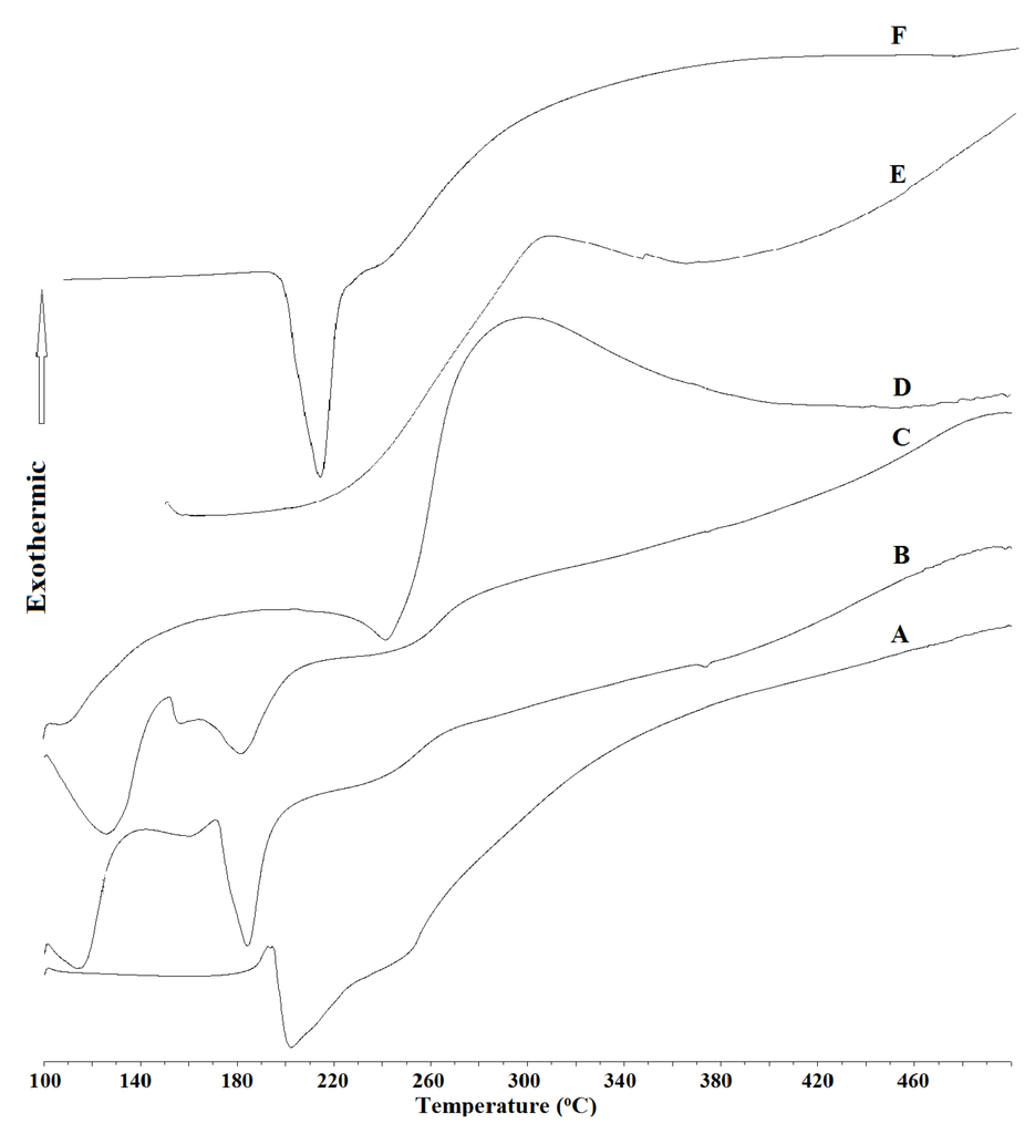 DSC of the hydrolyzed products (A) 1 (S3/5 Å-Zeolite); (B) 2 (S3/10 Å-Zeolite); (C) 3 (S3/3 Å-Zeolite) and (D) 4 (S3/No zeolite); (E) chitosan; and (F) glucosamine.