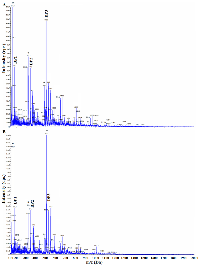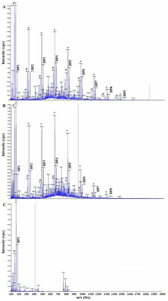 The theoretical molar mass values of chito-oligomers are: DP1 = 179.16, DP2 = 340.31, DP3 = 501.45, DP4 = 662.60, DP5 = 823.74, DP6 = 984.89, DP7 = 1146.03, DP8 = 1307.18, DP9 = 1468.32. The masses obtained experimentally are shown in Figure 3 for the products 4 (S3/No zeolite) and 1 (S3/5 Å-Zeolite). Similar values were obtained for all S3 products which gave positive tests in Table 2. Note that there are peaks resulting from the dehydration of the chito-oligomers (marked by * and # in Figure 3) and are due to the loss of one and two water molecules. The dehydration peaks were a result of the analysis method because these peaks were also observed in the case of the glucosamine standard (Figure 3). Interestingly, the intensity of the m/z peaks of the chito-oligomers decreases in the order of increasing DP. The highest DP chio-oligomer detected was that of DP = 9.