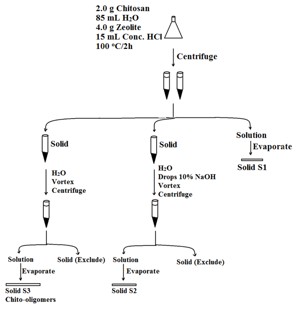 A 2.0 g sample of chitosan was mixed with 85 mL deionized water using a magnetic stirrer. A 4.0 g of zeolite (HZSM-5, molecular sieves 10 Å and 3 Å) was then added followed by the addition of 15 mL of concentrated HCl solution to give a final concentration of 1.8 M HCl solution. The mixture was then heated under reflux at 100 °C with stirring for 2 h. The mixture was then cooled to room temperature and divided into two portions and centrifuged (Hermle Z 320) at 4500 rpm for 15 min. The two solutions in the 50 mL centrifuge tubes were combined and evaporated for dryness (S1, Scheme 1) using a rotary evaporator. Distilled water was then added to the solid obtained in the two centrifuge tubes and the tubes were shaken using vortex (Labinco). The solution in one centrifuge tube was neutralized to pH = 8 using 10% NaOH solution. The resultant two mixtures were centrifuged at 4500 rpm for 15 min. The two resultant solutions were separated and evaporated in a rotary evaporator. The solids obtained from base and acid retrieval were designated S2 and S3, respectively (Scheme 1).