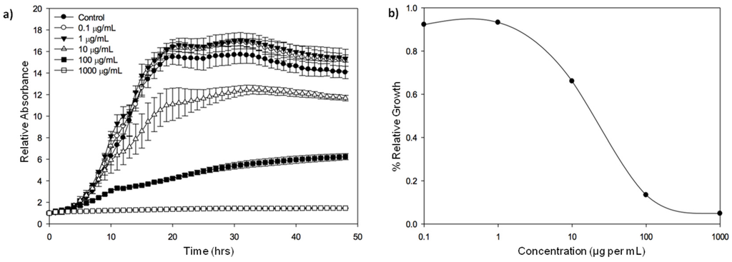 Growth inhibition of Vibrio tasmaniensis CIP 107715 by purified marennine, the blue pigment produced by Haslea ostrearia. (a) V. tasmaniensis was grown over night at 25 °C, cells were then washed with sterile water 2 times and adjusted to an OD600 = 0.5. Cells were added to wells with marennine in the following concentrations: 0, 0.1, 1, 10, 100 and 1000 μg per mL. Kinetics were run at OD600 for 48 h, with measurements taken every 30 min (n = 3); (b) Relative values were graphed in order to account for the absorbance differences due to the pigment. The effective concentration reducing bacteria growth rate by 50%, EC50, was estimated at 19.14 μg per mL (Standard error: 6.73) (original results).
