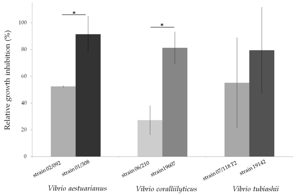 Relative growth inhibition of three Vibrio species, V. aestuarianus, V. coralliilyticus, V. tubiashii, after a 48 h exposition to purified extracellular marennine, produced by the diatom Haslea ostrearia. Each strain was grown over night in a Mueller-Hinton Broth medium at 22 °C and their concentration was then adjusted to an OD600 = 0.1. Bacterial cultures were exposed for 48 h to marennine at a concentration of 100 µg per mL before OD measurement. The relative growth inhibition was assessed in comparison with the growth of the control, not exposed to marennine. Results are means ± SD, for two separate experiments conducted using triplicates. A significant difference of sensitivity (*) between the two V. aestuarianus and V. coralliilyticus strains was observed (ANOVA statistical test, p-value 0.01 and 7 × 10−4 respectively). (original results).