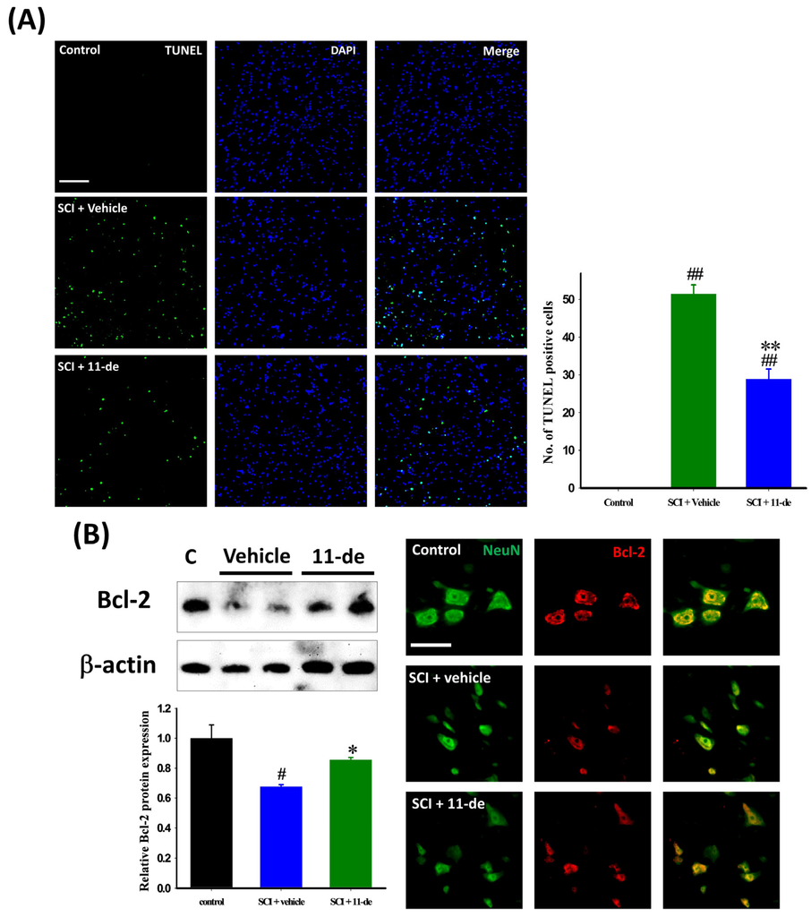 11-Dehydrosinulariolide reduced apoptosis after SCI. The rats were sacrificed 8 h after SCI, and their spinal cords were harvested. The apoptotic cells were identified through a TUNEL assay (A); Cells with the TUNEL signal (green), which colocalized with DAPI (blue), were counted as apoptotic. 11-Dehydrosinulariolide significantly reduced the number of apoptotic cells after SCI. 11-Dehydrosinulariolide administration attenuated SCI-induced Bcl-2 downregulation (B); The neuronal Bcl-2 IR signal in the 11-dehydrosinulariolide group was stronger than that in the SCI group. Data are expressed as means ± SEMs; # p < 0.05 and ## p < 0.001 compared with the control group; * p < 0.05 and ** p < 0.001 compared with the vehicle group. Scale bars = 100 μm in (A), 50 μm in (B).
