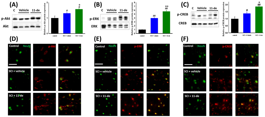 11-Dehydrosinulariolide enhanced the SCI-induced activation of cell survival-related signaling proteins, Akt and ERK. The rats were sacrificed 8 h after SCI, and their spinal cords were harvested to perform immunoblotting (A–C) and immunohistochemistry (D–F). 11-Dehydrosinulariolide (i.t.) significantly enhanced the SCI-induced activation of neuronal Akt, ERK, and CREB. Data are expressed as means ± SEMs; # p < 0.05 and ## p < 0.001 compared with the control group; * p < 0.05 and ** p < 0.001 compared with the vehicle group. Scale bars = 50 μm.