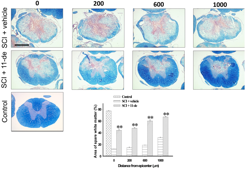 To estimate the amount of white matter spared after SCI, spinal cord sections were stained with myelin-specific eriochrome cyanine R (blue) and counterstained with neutral red (red). The rats were sacrificed on day 7 after SCI, their spinal cords were sectioned continuously, and the section with the largest lesion was defined as the lesion epicenter. Figure 4 shows that the spinal cord sections with spared white matter are 200, 600, and 1000 μm rostral to the lesion epicenter. 11-Dehydrosinulariolide administration significantly enhanced tissue sparing on day 7 after SCI. Therefore, 11-dehydrosinulariolide treatment reduces demyelination in an injured spinal cord.