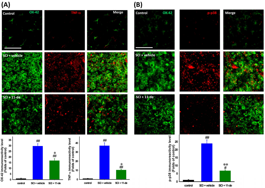 11-Dehydrosinulariolide attenuated SCI-induced inflammation. The rats were sacrificed on day 7 after SCI. The proinflammatory cytokine TNF-α (A) and inflammation-related MAPK p-p38 (B) were examined through immunohistochemistry. 11-Dehydrosinulariolide (i.t.) attenuated SCI-induced microglia activation. The IR signals of TNF-α and p-p38 were attenuated after 11-dehydrosinulariolide administration. The results also demonstrated that the anti-inflammatory effect and attenuation of microglia activation may occur through that of p38 phosphorylation (B). Data are expressed as the means ± SEMs; # p < 0.05 and ## p < 0.001 compared with the control group; * p < 0.05 and ** p < 0.001 compared with the vehicle group. Scale bars = 100 μm.