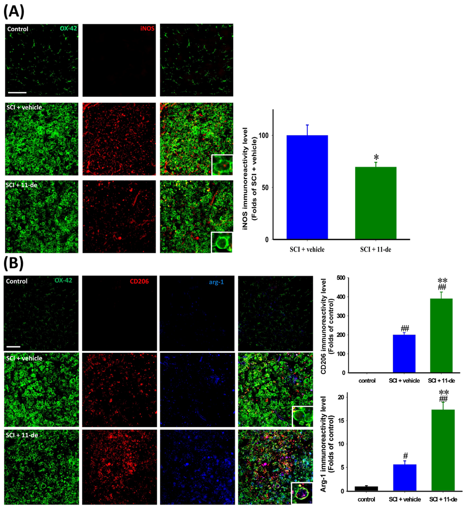 11-Dehydrosinulariolide promoted an alternative pathway of microglia activation after SCI. The rats were sacrificed on day 7 after SCI. The marker of M1 microglia iNOS was detected through immunohistochemistry (A). 11-Dehydrosinulariolide administration attenuated SCI-induced iNOS upregulation. The M2 microglia markers CD206 and ARG1 were also detected through immunohistochemistry (B). Microglia in both vehicle- and 11-dehydrosinulariolide-treated spinal cords were activated and round. However, 11-dehydrosinulariolide administration enhanced SCI-induced the upregulation of CD206 and ARG1 IR signals. Data are expressed as means ± SEMs; # p < 0.05 and ## p < 0.001 compared with the control group; * p < 0.05 and ** p < 0.001 compared with the vehicle group. Scale bars = 100 μm.