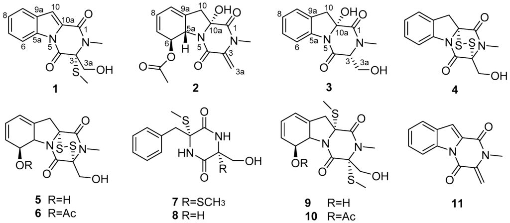 Marine microorganisms are a rich source of structurally unique and bioactive metabolites. Even considering the trend of recent years that many marine natural products research efforts are directed towards microorganisms, there has been a sharp upward swing in the number of new metabolites reported from marine microorganisms [1,2]. Deep-sea organisms survive under extreme conditions such as an absence of light, low levels of oxygen, and intensely high pressures. These factors may result in the production of structurally unique secondary metabolites. Although thousands of natural products with diverse structural types have been reported from marine flora and fauna, the secondary metabolites derived from the deep-sea fungi at depths of over 1000 m below the surface are limited [3,4]. In our ongoing effort to search for structurally diverse and biologically significant metabolites from deep-sea fungi [5,6,7,8], we found that a culture broth of Dichotomomyces cejpii FS110, which was isolated from deep-sea sediment, showed strong growth inhibitory effects against four human tumor cell lines [9]. Bioassay-guided separation of the EtOAc extract of culture broth yielded three new diketopiperazines (1–3), along with eight known analogues. All of the isolated compounds (1–11) were evaluated for their cytotoxic activities against the SF-268, MCF-7, NCI-H460, and HepG-2 tumor cell lines and inhibitory activity against α-glucosidase. Herein, the isolation, structural elucidation, cytotoxic activities, and α-glucosidase inhibitory activities of all these isolates are described.