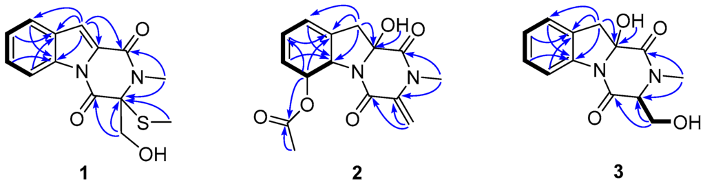 Key COSY (▬) and HMBC (→) correlations for compounds 1–3.