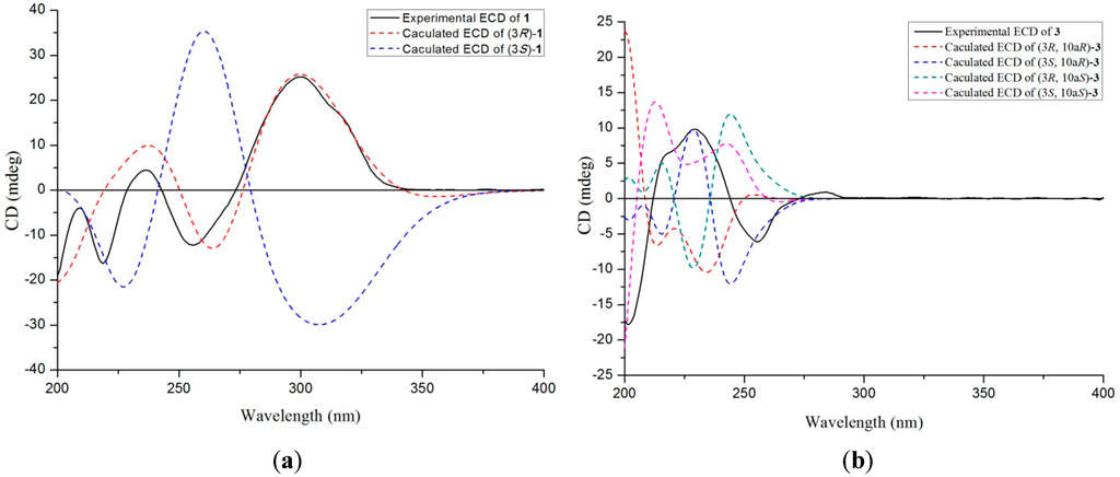 The quantum-chemical ECD calculation methods were used to establish the absolute configurations of compounds 1 and 3. The compounds were charged using the Gasteiger–Hückel method and the preliminary random conformational search was performed with the SYBYL 8.0 software package using the MMFF94 molecular mechanics force field. The geometry optimizations were then performed by using DFT at the B3LYP/6-31G (d) level as implemented in the Gaussian 09 program package. The stable conformers obtained were subsequently submitted to ECD calculations by TDDFT calculations (B3LYP/6-31G (d)) with Gaussian 09.