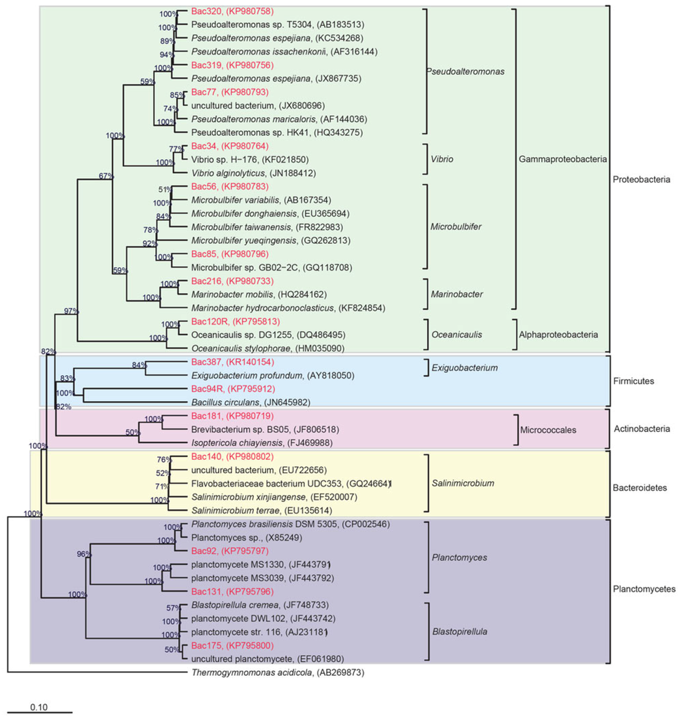 Out of the 251 isolates, 15 could be considered putative novel species as they have ≤98% similarity to 16S rRNA gene sequences deposited in GenBank [48,49,50,51] (Table 2, Figure 1). The taxonomic classification placed the 15 isolates into five phyla comprising 12 genera and 15 species: Proteobacteria (Vibrio alginolyticus, Microbulbifer maritimus, Microbulbifer gwangyangensis, Oceanicaulis sp., Marinobacter xestospongiae, Pseudoalteromonas espejiana, Pseudoalteromonas flavipulchra, Pseudoalteromonas atlantica), Firmicutes (Bacillus simplex and Exiguobacterium profundum), Planctomycetes (Planctomyces brasiliensis, Planctomycete sp., Blastopirellula cremea), Actinobacteria (Brevibacterium avium) and Bacteroidetes (Flavobacteriaceae bacterium). Interestingly, 11 of the 15 putative novel species were isolated from the 10% MA medium. Thus, low nutrient media may be more suitable for targeting the isolation of those bacteria that are more difficult to culture—the rationale being that it provides an environment that does not facilitate the growth of easily culturable bacteria that thrive in high nutrient media and usually overshadow or outcompete the so-called “unculturable” bacteria. Moreover, from the putative novel species, 53.3% have a genetic affiliation with the phylum Proteobacteria, and 13.3% have a genetic affiliation with the phylum Firmicutes. Interestingly, 75.0% of putative novel strains were isolated from RHL.
