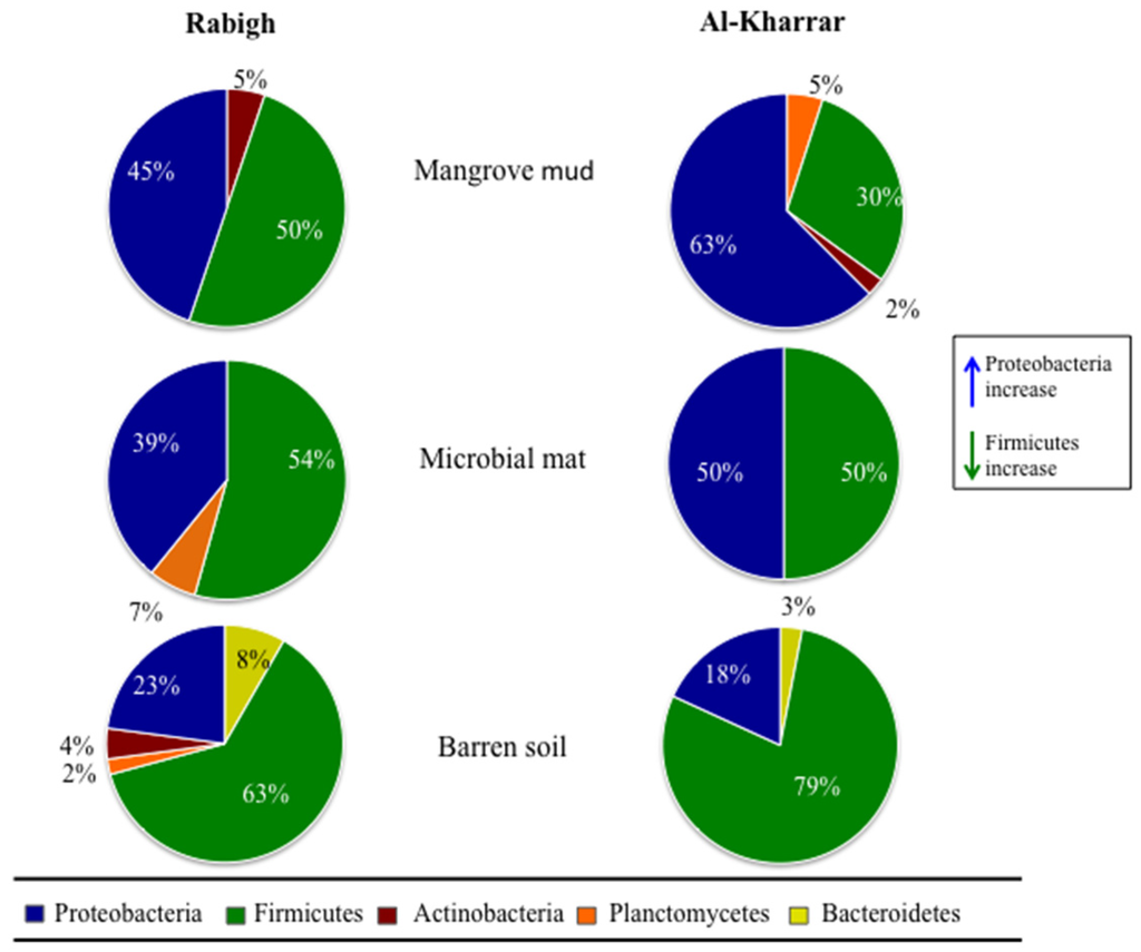 Overview of cultured microorganisms, at phylum level, isolated from Rabigh and Al-Kharrar sediments.