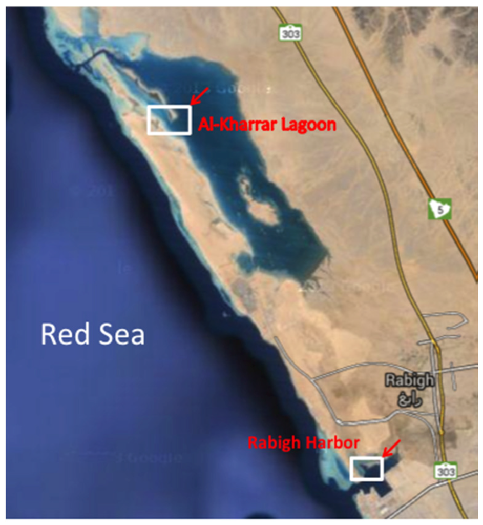 - Al-Washmi, H. Sedimentological Aspects and Environmental Conditions Recognized from the Bottom Sediments of Al-Kharrar Lagoon, Eastern Red Sea Coastal Plain, Saudi Arabia. J. KAU Mar. Sci. 1999, 10, 71–87. [Google Scholar] [CrossRef]