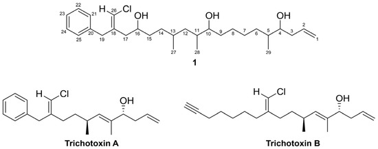 Trichophycin A (1): pale yellow oil; 4.3 (MeOH, c 0.20); UV (MeOH) λmax (log ε) 204 (4.0) nm; 1H-NMR (800 MHz, CDCl3); and 13C-NMR (200 MHz, CDCl3), see Table 1; HRESIMS m/z 479.3282 [M + H]+ (calculated for C29H48ClO3, 479.3292).