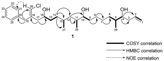 The 13C-NMR spectra of 1 showed the characteristic signals of a phenyl group for positions C-20 to C-25 (δC 138.0, 129.0, 128.6, 126.7, 128.6, 129.0). A deshielded methylene (H2-19, δH 3.46) showed HMBC correlations to the quaternary carbon of the aromatic ring (C-20, δC 138.0), and C-21 and C-25 on the aromatic ring (δC 129.0). Additionally, the H2-19 methylene showed HMBC correlations to a moderately polarized olefin comprised of a quaternary carbon (C-18, δC 139.5) and a carbon (C-26, δC 116.2) bearing a singlet methine proton at δH 5.99. These chemical shifts were consistent with the presence of a vinyl chloride functionality, and considering the aromatic moiety, accounted for 5 of the 6 degrees of unsaturation required. NOE correlations between the H-26 (δH 5.99) and H-21 (δH 7.17) and H2-19 (δH 3.46) supported a Z configuration of the vinyl chloride (Figure S7). The H2-19 methylene showed HMBC correlation to C-17 (δC 38.2). The HSQC showed C-17 was correlated to deshielded methylene protons (δH 2.38, 2.28). This second group of deshielded methylene protons (H2-17) showed HMBC correlations to the vinyl chloride-containing olefin and to an oxygen-bearing carbon (C-16, δC 70.7). Examination of the COSY spectrum (see Figure S5) showed that the oxymethine (H-16, δH 3.79) was coupled to a methylene group (H2-15 δH 1.52 and 1.44). These H2-15 protons showed COSY correlations to the H2-14 methylene (δH 1.35 and 1.22). The H2-14 methylene protons showed HMBC correlations to C-13 (δC 29.8), C-12 (δC 40.8), and the C-27 methyl group (δC 20.4). The H-13 methine (δH 1.52) showed a COSY correlation to H3-27 (δH 0.87). The H2-12 methylene protons (δH 1.39, 1.00) showed HMBC correlations to a second tertiary carbon (C-11, δC 35.2) bearing an adjacent methyl group (C-28, δC 13.9) and an HMBC correlation to a second oxygen-bearing carbon (C-10, δC 74.5). Bidirectional HMBC correlations established four methylene groups between C-10 and C-5. The H-5 methine showed COSY correlations to H-6b (δH 1.19), H3-29 (δH 0.90), and the H-4 oxymethine (δH 3.55). The oxymethine showed HMBC correlations to C-3 (δC 39.1) and C-2 (δC 135.6). A COSY correlation between H-2 (δH 5.83) and H2-1 (δH 5.15, 5.12) established a monosubstituted terminal olefin functionality, satisfied the final degree of unsaturation, and demonstrated that 1 was a linear polyketide. Selected 2D correlations utilized in determining the planar structure of 1 are shown in Figure 2. Examination of the TOCSY spectrum supported COSY correlations (Figure S6).