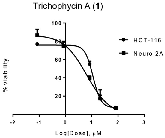 Dose-response curves of trichophycin A (1) tested against Neuro-2A murine neuroblastoma cells and HCT-116 human colon cancer cells.