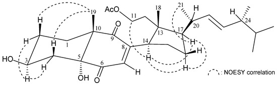 The correlations identified using nuclear Overhauser effect spectroscopy (NOESY) in addition to comparison of NMR data with those of known 9,11-secosterol 8, isolated from Korean marine sponge Ircinia sp. [9], and pinnisterol A (9) [4], enabled clarification of the configuration of 1 (Figure 1). The stereochemistries of stereogenic centers C-3, C-5, C-10, C-13, C-14, and C-17 in 1 were the same as those of 8. In addition, the main NOE correlations for 1 were interactions between H-3/H-2αH 2.00), H-2βH 1.49)/H3-19, H-3/H-4αH 2.17), H-4βH 1.79)/H3-19; thus, H-3 and the 5-hydroxy group in 1 should be positioned on the α-face (Figure 2).