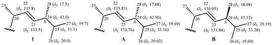 Figure 3. Schematic diagrams of 13C NMR chemical shift data of the side-chain of pinnisterol D (1), (22E,24R)-24-methylcholesta-5,22-dien-3β-ol (A), and (22E,24S)-24-methylcholesta-5,22-dien-3β-ol (B) [10].