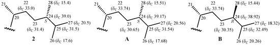 Figure 4. Schematic diagrams of 13C NMR chemical shift data of the side-chain of pinnisterol E (2), (24S)-24-methylcholest-5-en-3β-ol (A), and (24R)-24-methylcholest-5-en-3β-ol (B) [9].