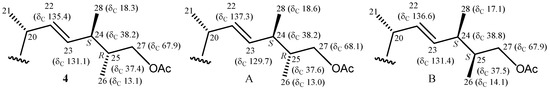 Figure 5. Schematic diagrams of 13C NMR chemical shift data of the side-chain of pinnisterol G (4), echrebsteroid C (A), and echrebsteroid B (B) [11].