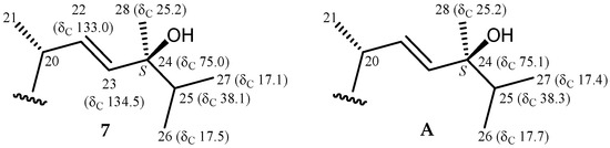 Figure 6. Schematic diagrams of 13C NMR chemical shift data of the side-chain of pinnisterol J (7) and 24(S)-hydroxyvitamin D2 (A) [12].