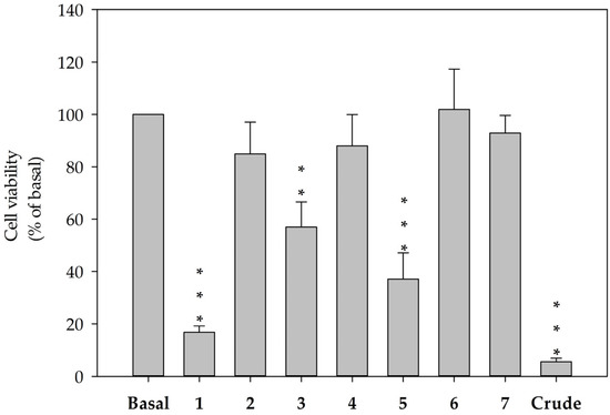 Figure 7. Decreased cell viability in HSC-T6 cells treated with secosterols 17 for 24 h at a concentration of 10 μM. Cells were treated with secosterols, DMSO (control) or coral crude extract at 6 μg/mL. Cytotoxicity was monitored spectrophotometrically at OD 450 nm. Quantitative data are expressed as the mean ± S.E.M. (n = 3–4). ** p < 0.01, *** p < 0.001 compared to basal.