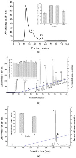 Elution profiles and calcium-binding capacities of calcium-binding peptides. (a) Sephadex G-25 gel filtration chromatography of SPH; (b) semi-preparative C18 RP-HPLC of fraction F3; and (c) analytic RP-HPLC of fraction 17 from semi-preparative HPLC.