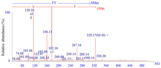 The amino acid sequence of fraction A was determined to be Phe-Tyr (FY) with a molecular weight (MW) of 328.17 Da using liquid chromatography-electrospray ionization-tandem mass spectrometry (LC-ESI-MS/MS) (Figure 2). Subsequently, the identified peptide was chemically synthesized and the calcium-binding capacity was determined to be 125.91 ± 1.63 μg/mg, which was equivalent to the purified sample. Calcium-binding peptides from various sources with different MW and sequences have been isolated. Jeon reported that a peptide purified from Chlorella protein hydrolysates had a calcium binding activity of 0.166 mM and was determined to be 700.48 Da [18]. In our previous works, four dipeptides or tripeptides from whey protein hydrolysates were confirmed to possess 70–80 μg/mg calcium-binding capacity [19,20,21,22]. Not only the differences in the length and net charge of peptides, but also the different amino acid composition and sequence, could affect the extent of chelate formation with divalent metal cations [15,23]. Previous reports showed that the phosphorylation of tyrosine residues could provide appropriate chelating sites for positively charged metals, like calcium, zinc, and iron [24]. Kim indicated that an iron-binding peptide separated from heated whey hydrolysates contained 16.58% of phenylalanine residues, which was higher than other amino acids [25]. Moreover, dipeptide or tripeptide was deemed to promote metal ion absorption more effectively than higher MW peptides in intestinal epithelial cells [26]. Consequently, both of the Phe and Tyr residues in the purified peptide might contributed to chelation with metal cations.