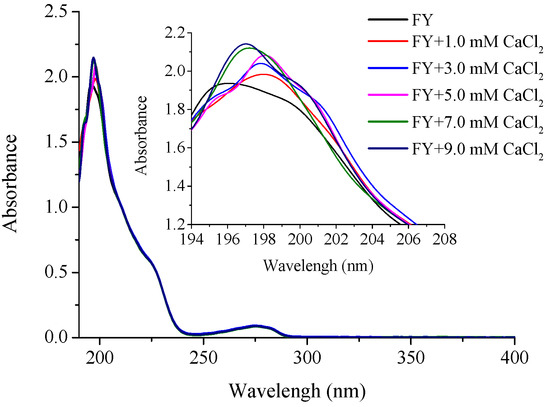 UV spectra of FY with different CaCl2 concentrations over the wavelength range from 190 to 400 nm.