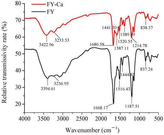Fourier transform infrared (FTIR) spectra of FY and FY-Ca chelate in the regions from 4000 to 400 cm−1.