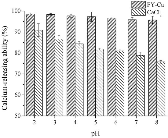 The calcium-releasing percentages of the FY-Ca chelate and CaCl2 at different pH were shown in Figure 7. The solubility of FY-Ca and CaCl2 was obviously different. The calcium-releasing percentage of CaCl2 exhibited a distinctly downward trend with the increase of pH value, and was reduced to 75.7% at pH 8.0, which could deduce that the free calcium ions and OH− formed precipitates and led to a decline in the percentage. In contrast, the calcium-releasing percentage of FY-Ca chelate was always apparently higher than that of CaCl2 at pH 2.0–8.0, and it maintained a relatively stable value of about 95% as well. The pH value in human intestinal tract is approximately pH 7.2, and FY-Ca chelate had higher solubility and better bioavailability in the gastrointestinal tract, which implied that FY-Ca chelate could be effectively absorbed and transported by intestinal epithelial cells than CaCl2 [35].