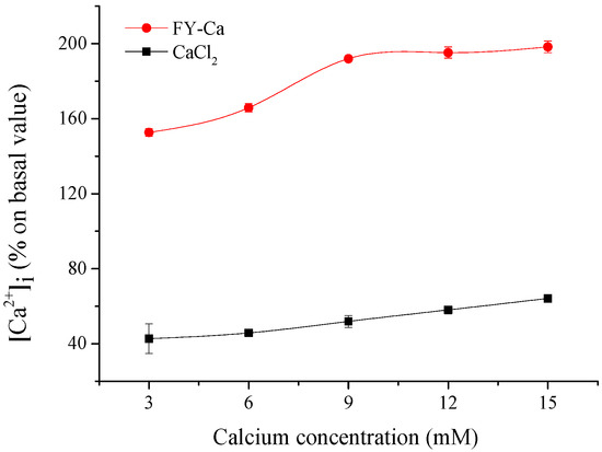 For the uptake studies, Caco-2 cells were pre-incubated with FY-Ca chelate at different concentrations with CaCl2 used as control. The effect of FY-Ca on the intracellular calcium concentration increased dose-dependently and then approximately trended to stable when the calcium concentration reached 9 mM, according to results in Figure 8. Additionally, the absorption-enhanced effects of FY-Ca were more than three times that of CaCl2 at the same calcium concentration. Similar findings were also reported for desalted duck egg white peptides [36], soybean protein hydrolysates-calcium complex [9], and CPPs [37], which might act as calcium carriers and interact with the plasma membrane to transport calcium to the cytosol and ultimately significantly promote calcium uptake.
