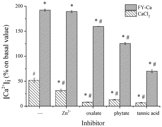 Effect of FY-Ca chelate on calcium bioavailability under the action of dietary inhibition factors. The concentration of calcium was 10 mM and tannic acid/Ca, oxalate/Ca, phytate/Ca, or Zn/Ca = 20:1. * Statistical significance p < 0.05, compared with the CaCl2 control group. # Statistical significance p < 0.05, compared with the FY-Ca control group.