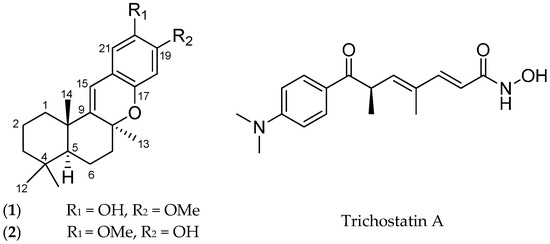 Compounds 1 and 2 were evaluated for their up-regulatory activity on an SR-B1 HepG2 stable cell line using Trichostatin-A (TSA) as a positive control in a reporter gene assay. Both compounds increased the luciferase intensity of SR-B1 HepG2 cells in a dose-dependent manner with EC50 values for 1 and 2 of 1.78 μM and 3.05 μM, respectively (Figure 7). The efficacies of 1 and 2, compared with TSA (100%), were estimated to be 130% and 121%, respectively (Table 2). Hence, compounds 1 and 2 are full agonists. It has been widely reported that SR-B1, the high-density lipoproteins (HDL) receptor, plays an important role in the development of atherosclerosis [26,27,28]. Zhang and his co-workers demonstrated an increase of 86% in mean atherosclerotic lesion of the proximal aorta in SR-B1−/− as compared to SR-B1+/+ apolipoprotein E-deficient mice that strongly suggested the antiatherogenic nature of SR-B1 in an in vivo model [29]. Therefore, this study indicates the potential role of the merosesquiterpene class of compounds in reducing the progression of atherosclerosis.