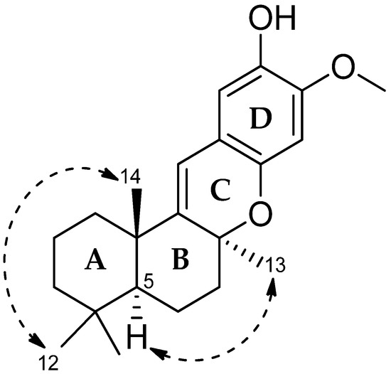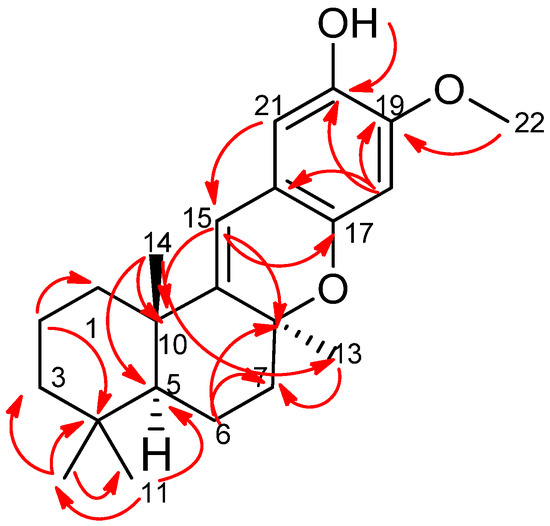Further analysis of the 13C NMR and heteronuclear single quantum for proton-carbon correlation (gHSQC) spectra (Figure 2) indicated that compound 1 contained eight quaternary carbons (δC 32.6, 38.1, 75.9, 115.0, 141.9, 145.9, 148.7, and 146.8 ppm), two aromatic carbons (δC 103.9 and 110.9 ppm), one olefinic (δC 114.1 ppm), four methyl carbons (δC 21.6, 24.9, 25.2, and 33.4 ppm), one methine (δC 32.6 ppm), one methoxy (δC 56.7 ppm), and five methylenes (δC 16.7, 18.9, 30.6, 38.7, and 41.7 ppm). Analysis of correlation spectroscopy (gCOSY) and gHSQC data led to the assignment of the ABCD ring system in compound 1. A gCOSY spectrum displayed correlations from methylene proton H-6 (δH 1.64 ppm) to H-7 (δH 1.88 ppm), indicating the connectivity of C-6 (δC 16.7 ppm) and C-7 (δC 30.6 ppm).