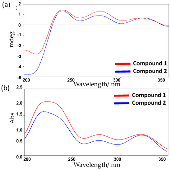 Experimental of an electronic circular dichroism (ECD) and ultraviolet (UV) spectra of 1 and 2.