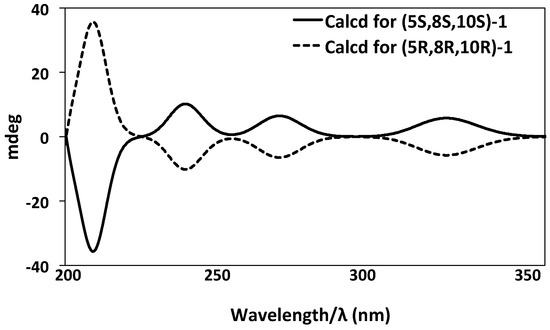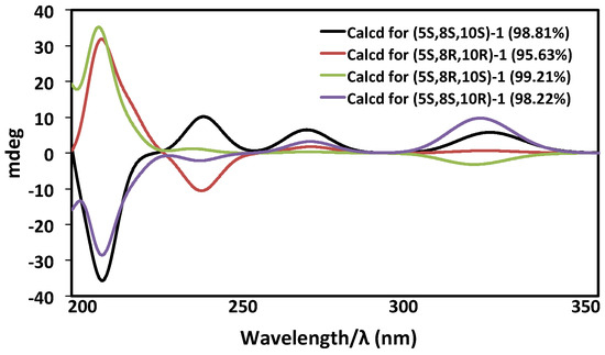 The absolute configuration of the known compound 2 had been obtained through degradative studies as 5S,8S,10S [24]. To confirm that 1 and 2 possess the same absolute configuration, ECD experimental and calculation studies by quantum mechanics were carried out. The OPLS-2005 force field in MacroModel was used to perform a conformational search with relative energies within 21 kJ/mol [25] and the basic set level (b3lyp/631gd) in solvent phase using the Gaussian 09 program, which was chosen for the geometric optimizations. There are three stereocenters with eight possible stereoisomers of 1. All eight possible stereoisomers of 1 were subjected to the ECD calculation analysis. A conformational search using the OPLS-2005 force field in MacroModel gave the Boltzmann populations for (5S,8S,10S/5R,8R,10R)-1, (5S,8R,10R/5R,8S,10S)-1, (5S,8R,10S/5R,8S,10R)-1, and (5S,8S,10R/5R,8R,10S)-1 as 98.8%, 95.6%, 99.2%, and 98.2%, respectively. The ECD spectra of four possible diastereomers were simulated at the (b3lyp/631gd) level in the solvent phase.