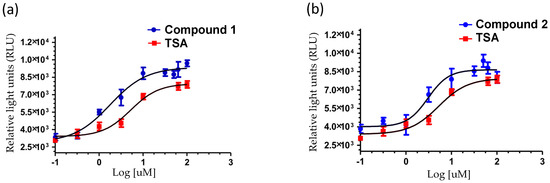Dose-response curve of (a) Compound 1 and TSA; (b) Compound 2 and TSA.